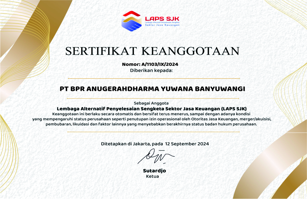 Sertifikat Keanggotaan diberikan kepada BPR ADY Banyuwangi sebagai anggota LAPS SJK