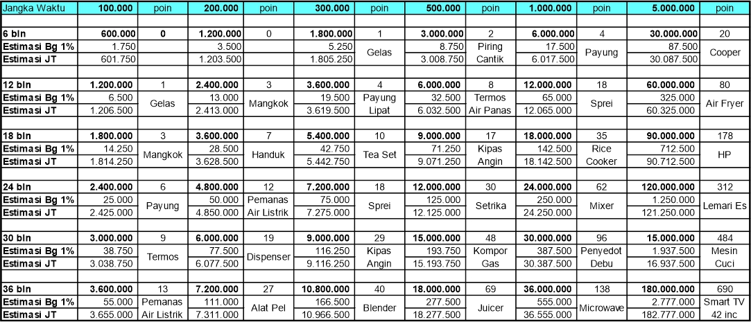 - Poin akan diberikan diakhir periode, nilai poin sesuai nominal yang diterima dan dibelikan barang sesuai dalam tabel atau permintaan nasabah dengan harga setara dengan poin